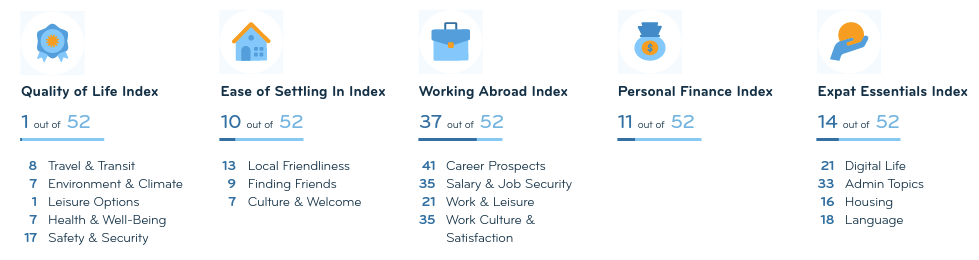 The Expat Insider has been run annually since 2014 and aims to measure how expats deal with the everyday obstacles associated with moving to a new country such as the language, safety, weather and bureaucracy.